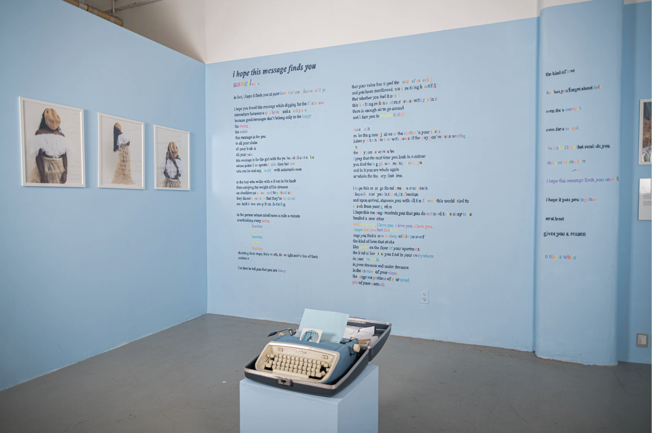 The installation includes 6 parts, merging poetry, film, digital media, music and photography to highlight various stages of the artist’s journey, dealing with themes of depression, anxiety, imposter syndrome, and microaggression, grounded by a central mural poem for the viewer titled, “I hope this message finds you unwell“. Visitors are invited to work their way around the room from various angles to see how the story shifts based on where they begin.